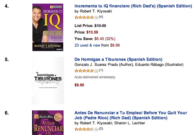Estoy francamente sorprendido por la respuesta. Amazon me ha reportado que en la categoría «Micro empresa y empresariado» ya entró a su lista de Best Sellers en español, en quinto lugar (vean las imágenes adjuntas). Justamente entre dos libros de la serie «Padre Rico, Padre Pobre», que son sin duda un referente en la categoría y que llevan varios años a la venta. Ahora, aceptemos que es una categoría relativamente pequeña; sin embargo ya está haciendo ruido en menos de una semana. También se colocó dentro de los cien mil libros más vendidos para Kindle. Nada mal si consideran que no tiene ni siete dias disponible y que el catálogo tiene un millón de libros disponibles en venta (no se consideran los gratuitos, con lo que el catálogo llega a tres millones, según reportes). Ya estamos dentro del 10% más vendido en toda la tienda Kindle. No es algo menor, y espero que mejore aún más…
