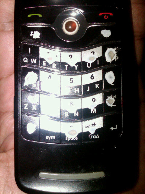 Pues bien, suponiendo que cada mensaje de los 15,000 enviados constó de 100 caracteres, quiere decir que en estos casi dos años escribí un millón y medio de golpes. Para darles una idea, sólo de noviembre de 2010 a la fecha, compilé un libro de unas 150 páginas de lo que he dicho en Twitter. Y para darles otra idea, así quedó el teclado de mi teléfono al cabo de esa «hazañita» (la foto la tomó @MarienPrado poco antes de que muriera este fon por… este… exceso de uso.).
