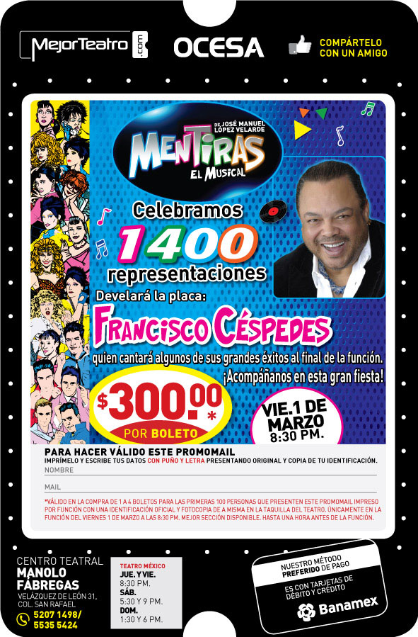 Y para darles la bienvenida, ¿Qué les parecería ir a ver «Mentiras» este viernes 1 de marzo, casi a mitad de precio, y escuchar a Francisco Céspedes cantar en vivo? Nada mal. Pues aquí les ofrezco un cupón de descuento para hacerlo. No dejen de comentar en mi Twitter @gjsuap y en el de @JaimeFranc con la etiqueta #TwitterosAlTeatro100 y en esta página si usaron la promoción… y, en su caso, que opinan de la obra. Si es posible, abran la imagen en una ventana adicional e imprímanlo. Hay que llevar copia de su identificación oficial y llenar el cupón en la taquilla. Y no olviden leer las letras chiquitas (válido de 1 a 4 boletos hasta una hora antes sólo en taquilla limitado a 100 cupones… y bla-bla-bla) ¡Disfruten!
